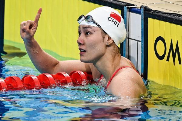 ↑广东队选手刘湘在比赛后,她以23秒97的成绩创亚洲纪录并获得冠军。新华社记者 吴刚 摄