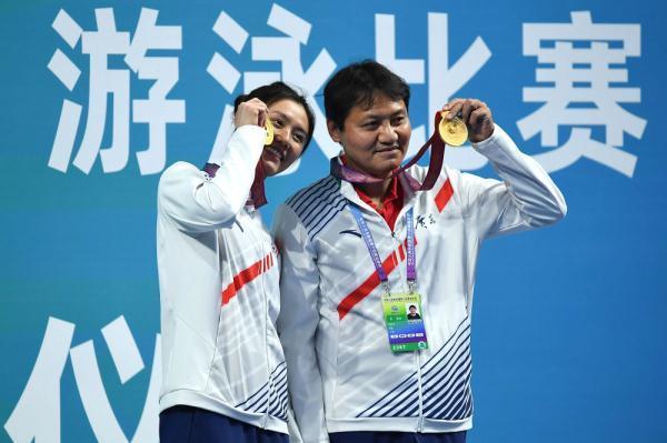 ↑冠军广东队选手刘湘(左)和教练崔登荣在颁奖仪式上合影。新华社记者 薛宇舸 摄