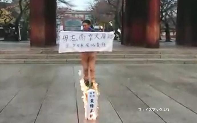 中国男子在靖国神社烧报纸 持抗议南京大屠杀旗帜