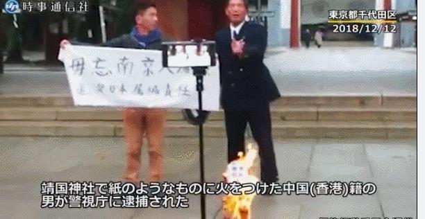 日媒称,12日上午,中国一男子在日本靖国神社门前燃烧报纸,被日本警方以“侵入建筑物”嫌疑逮捕。日本广播协会(NHK)12日报道称,该中国男子手持写有“抗议南京事件(即南京大屠杀)”的旗帜。日本警视厅正在对此进行调查。在日本NHK、朝日新闻等涉及南京大屠杀的报道上,仅仅以“南京事件”指代。