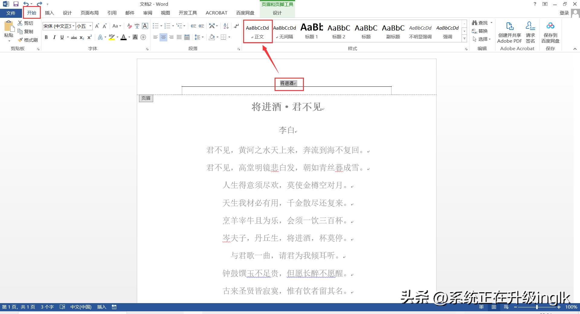 1、点击【开始】,在“样式”栏中点击“AaBbCcDd正文”。如图3