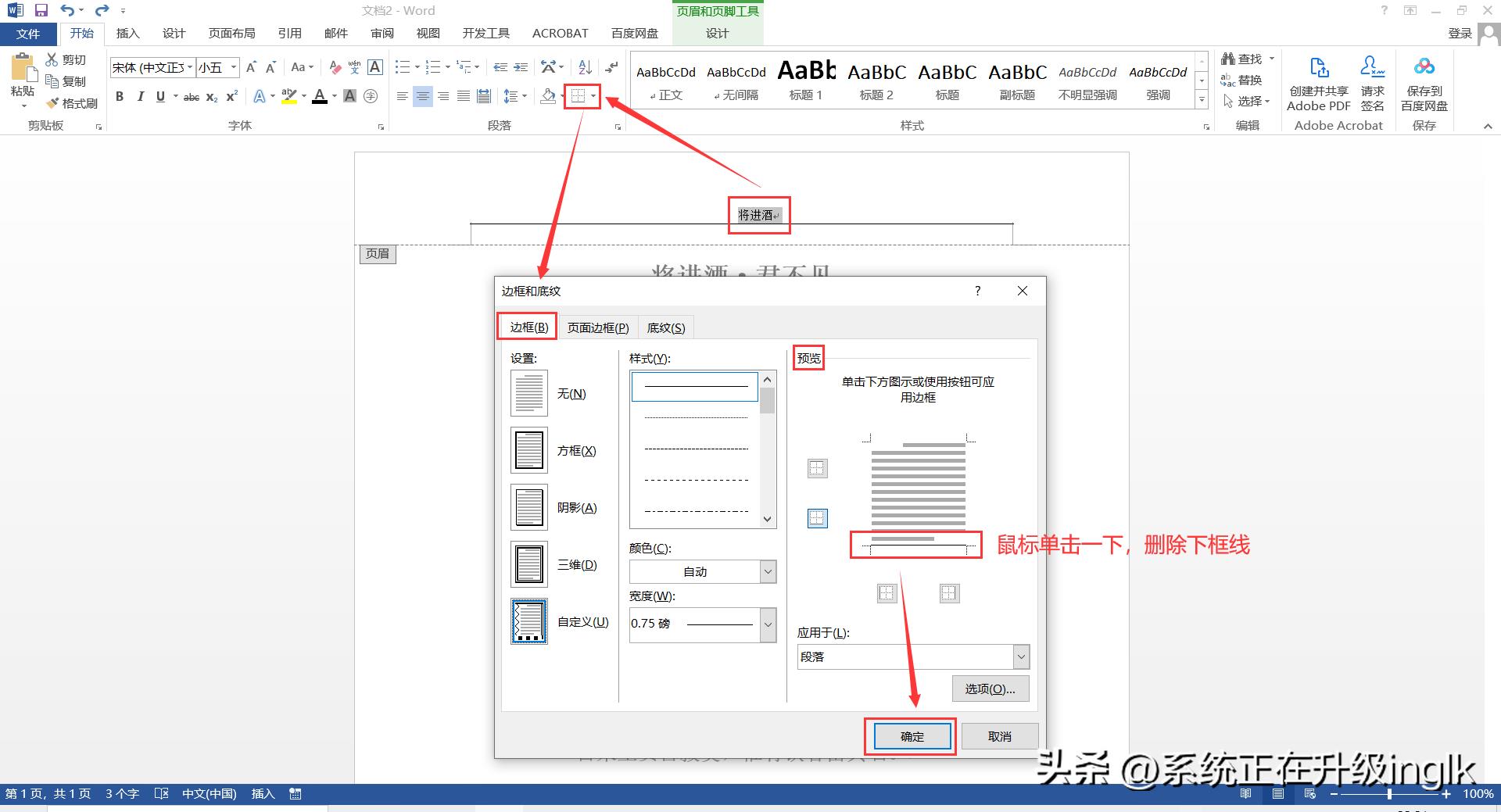 2、在弹出的【边框和底纹】对话框中,找到【边框】—【预览】,在“预览”处有一条下框线,鼠标点击一下,取消下框线,点击【确定】。如图6