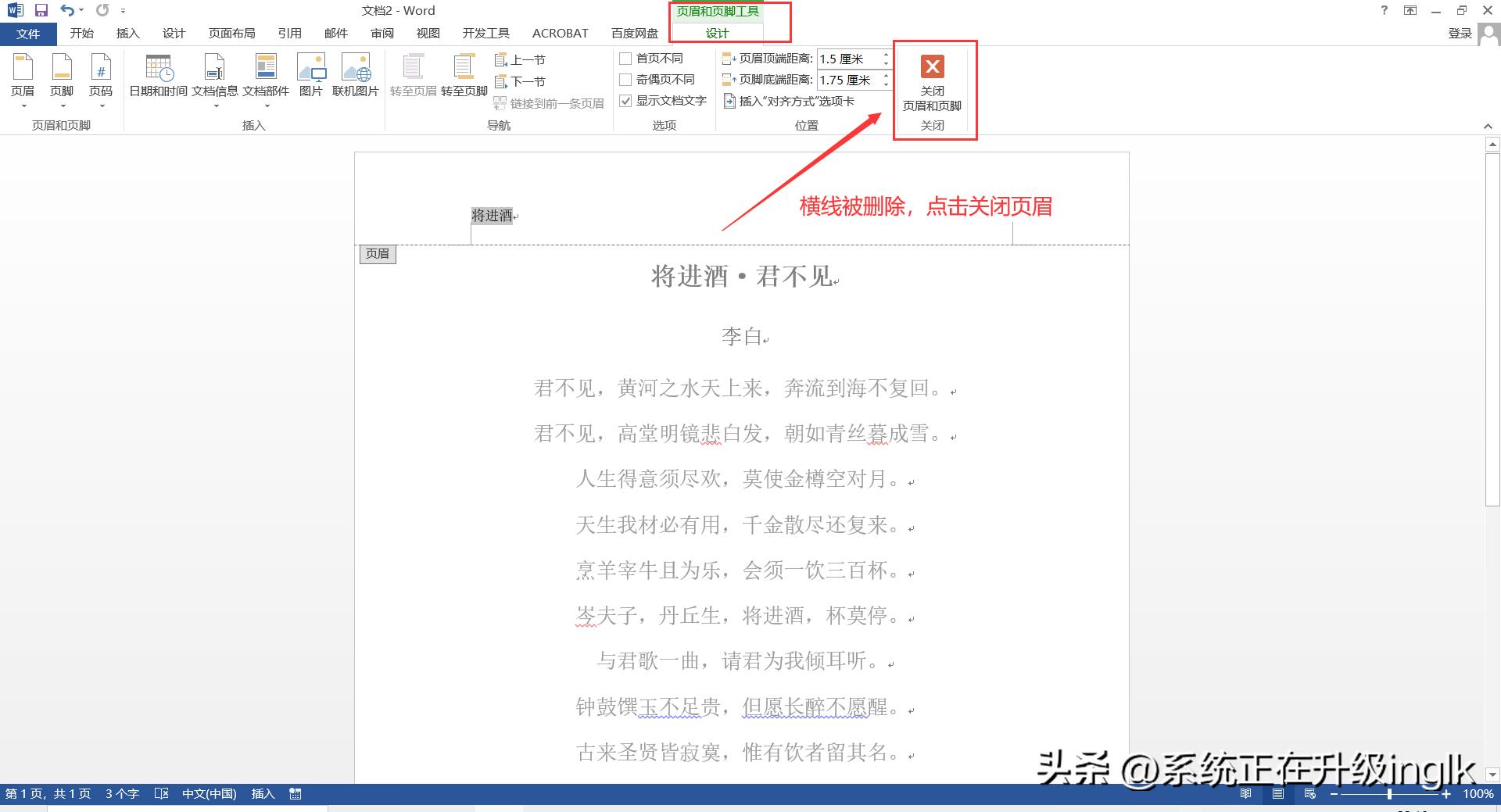 2、横线被删除,再点击【页眉和页脚工具/设计】—【关闭页眉和页脚】图标,退出页眉编辑状态。