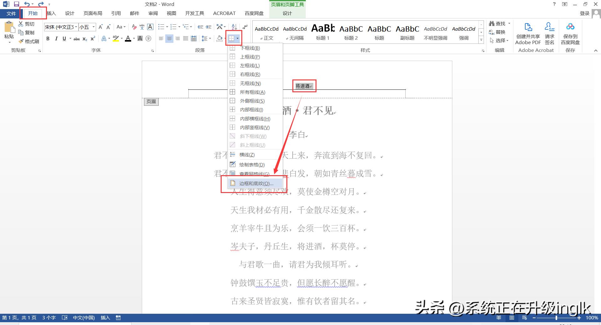 1、点击【开始】,在“段落”栏中点击【边框】图标下拉箭头,选择【边框和底纹】。如图5