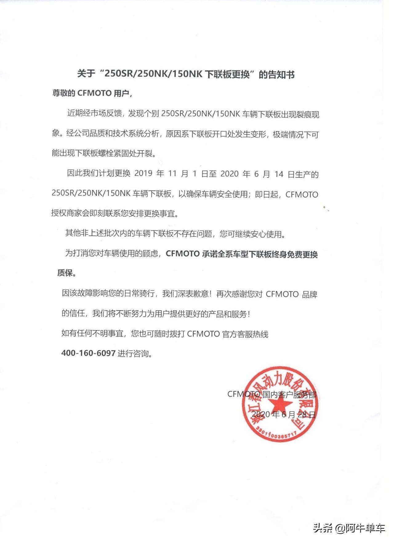 经过春风售后的受理和厂家的调查,发现这不是一起个例事件,250SR,250NK,150NK三款当红车型在一个批次内都存在着产品质量缺陷,下联板开口处易发生形变,极端情况下可能出现螺栓紧固处开裂等情况,严重危及骑士骑行安全。涉及批次为:2019年11月1日至2020年6月14日生产,相关批次到春风售后免费更换,并且终身质保。