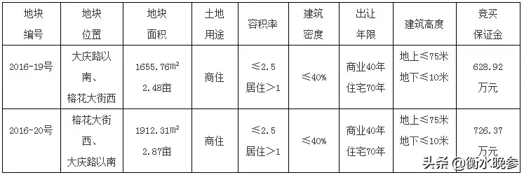 2016-20号地占地2.87亩,起始单价为253.1万元/亩,起始总额726.37万元。该宗地规划用途为居住、商服用地,其中商业建筑面积占地上总建筑面积比例不高于40%。该宗地需提供回迁安置面积960.76㎡,其中桃城区路北街道办事处京华社区居民委员会318㎡(依协议内容此面积不占用本区域土地),商业门店389.65㎡,居民用房253.11㎡,相关事宜由衡水市人民政府房屋征收办公室负责。