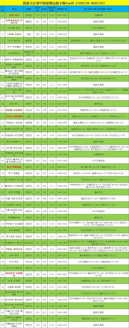 下面这张表格统计了从1928/1929赛季开始,到2022/2023赛季结束,西班牙足球甲级联赛历史上进球最多的前50名球员。