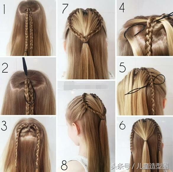 总是看很多爱心编发的图片却不知道怎么编吧?这款儿童编发详解解决你的疑惑。编发步骤:①从后脑勺顶部扎取一部分头发,分两股编马尾辫至发尾;②用编发针套上两股麻花辫从发根中间反穿插出来;③将两股马尾辫分居左右两侧;④将头围顶部的头发分一小缕一小缕穿插进马尾辫;⑤齐耳以上左右全部头发重复步骤四;⑥上部分头发全部穿插完,将散落在中间的头发用皮筋扎起来;⑦两侧小辫跟中间扎起的头发系在一起;⑧其余的头发梳直自然披在肩上就ok了!