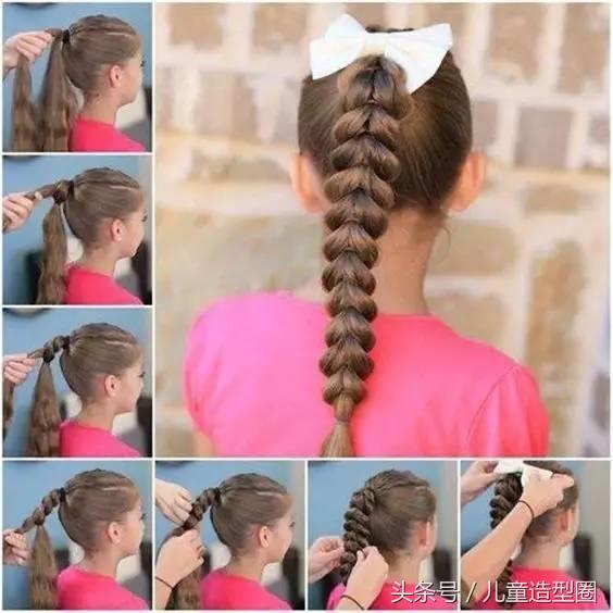 先来介绍一款较简单的编发,虽然简单但是并不是普通的一款麻花辫!此款儿童编发技巧主要借助橡皮筋完成,编发步骤:①将儿童头发高高扎马尾,将马尾的头发均分上下两部分;②将上部分头发用皮筋系5cm左右,下部分的头发从系好的小段头发中间从里往外穿插出来;③将步骤二交替进行操作;④编至发尾留5~7cm,用皮筋将头发系住;⑤将每一小段头发用手指均匀挑松;⑥在头顶扎马尾处系上一大朵可爱的蝴蝶结就ok了!