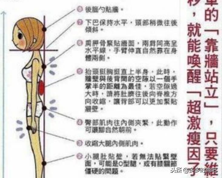 首先要说的就是站姿了,并不是随意的靠着强站就可以瘦的,站的时候一定要注意看你的后脑勺,肩胛骨,臀部,脚跟,小腿有没有紧贴着墙壁,同时下巴要保持着水平的状态,两肩膀要保持同一高度,手臂是自然垂直在身体的两侧,上半身保持着抬头挺胸的状态,后背和墙壁保持着一个拳头大小的缝隙,臀部肌肉紧贴着墙的时候,也要保持内侧夹紧,总之贴墙站不是随意的靠在墙上,一定要满足上面的条件才可以。