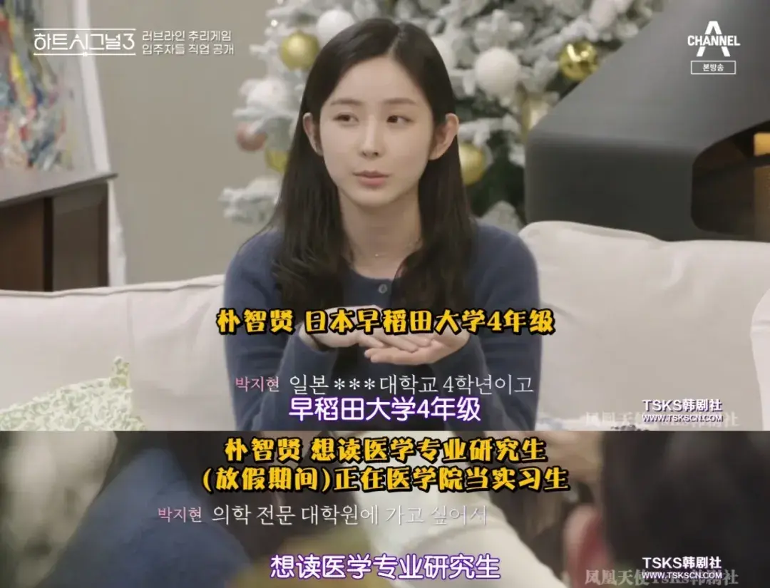 女三:朴智贤,24岁,留学日本,日本早稻田大学四年级的学生,想攻读医学专业的研究生,放假期间正在韩国的医学院做实习生,长相甜美,喜欢笑,笑起来女生看到都很心动的那种,非常喜欢厨艺并精通厨艺,镜头很多,目前是男嘉宾All女三。