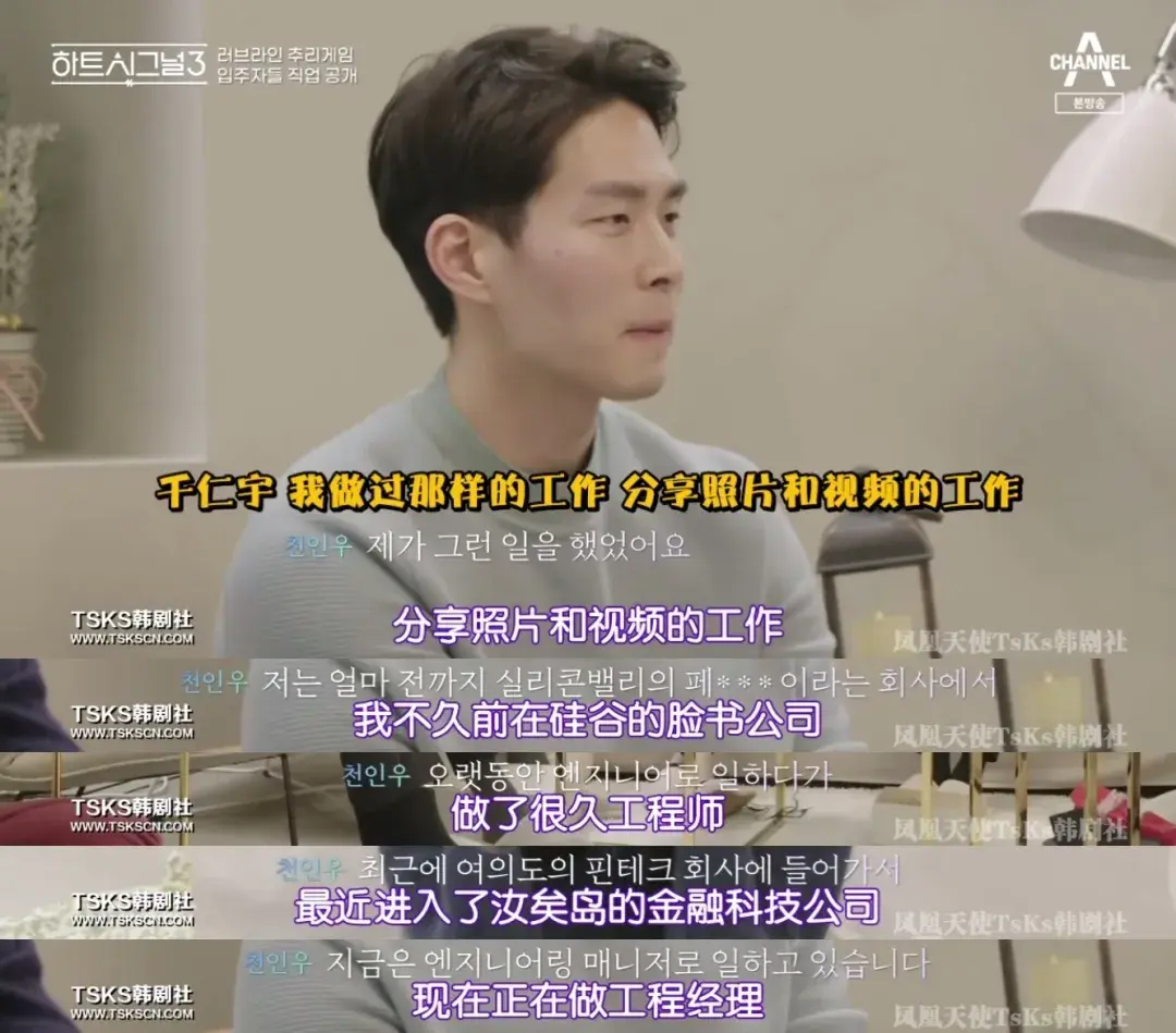 男一:千仁宇,31岁,之前在硅谷Facebook公司做工程师,在美国生活了十年,近一个月回到韩国在一家金融科技公司做工程经理,身材高大,表现欲强,性格非常“直进男”,有点明显的理工男特质。