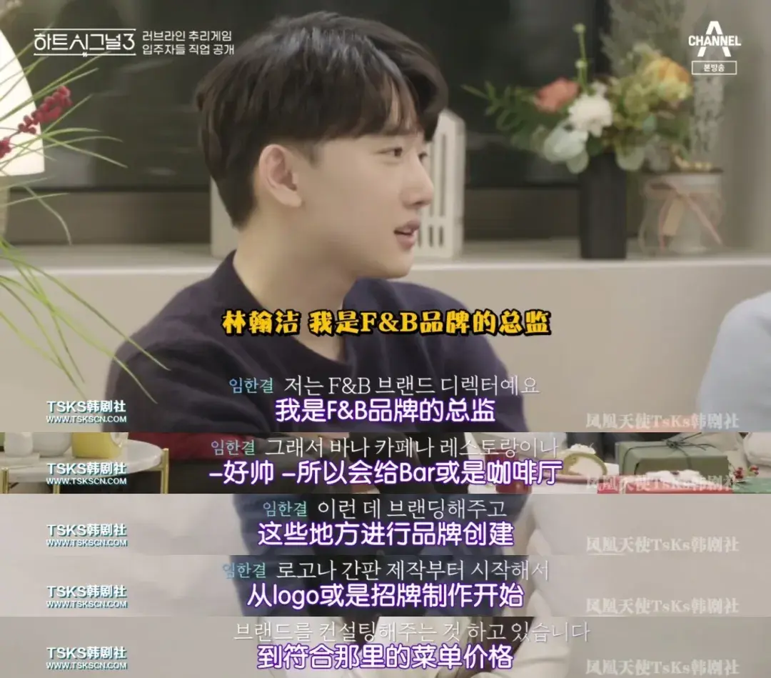 男三:林翰洁(翻译问题也叫任翰洁),31岁,品牌总监,为Bar或是咖啡厅这些地方进行品牌创建,从logo到饮品制作再到菜单价格制定都包括在内,拥有品酒师、咖啡师等等各种相关资格证,长相有些爱豆相,可以说是在男嘉宾里外貌A等的程度,略通厨艺,行事低调。