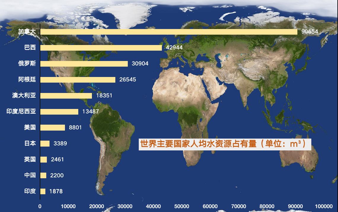 我国的水资源总量虽然在世界上排名第6位,可因人口基数大,分配到人均上的占有量就很少,我们人均水资源仅为2100m³,都还不到世界人均的三分之一。