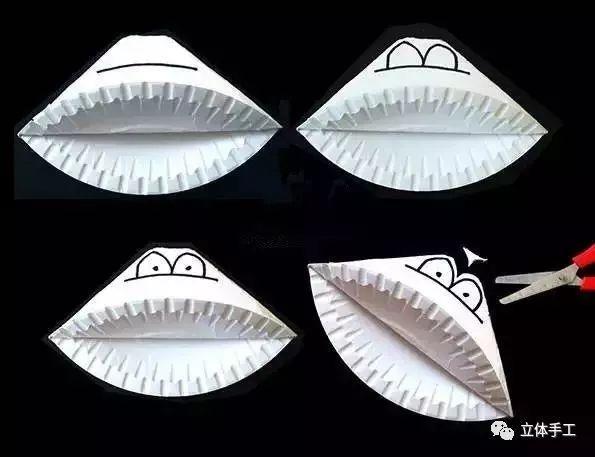 【制作步骤】纸盘对折,两角折向中间,把上层纸盘翻折出来,当做青蛙嘴巴部分。