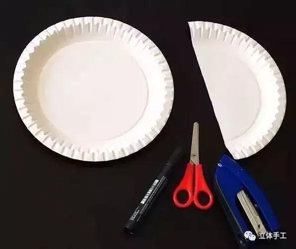 【准备材料】一个半白色纸盘、剪刀,尺子、订书机、笔、颜料。