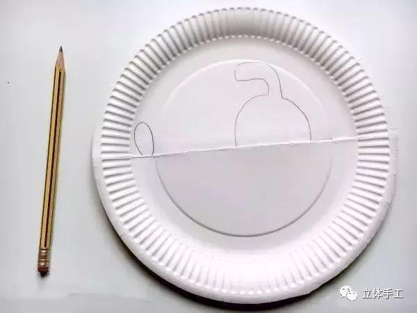【制作步骤】1.取一个完整的纸盘,对折,如图画出图案,填充黄色水粉颜料。
