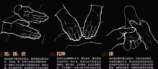 指的是用手指背侧小指、无名指、中指的掌指关节突起部分着力于皮肤上;通过腕关节伸屈和前臂旋转的复合运动,持续不断地作用于被按摩的部位上。