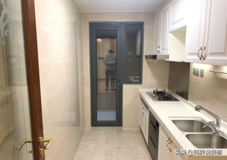 我们回头来看看厨房,干净清爽的淡灰色釉面瓷砖贴满了墙壁,不仅时尚好看还比较耐脏。一字型的工作台,白色的橱柜和吊柜,虽然空间并不大,然而整体收纳功能还是挺不错的。厨房的尽头还有一扇玻璃门,门后是2平米左右的小阳台。晾晒衣服有点够呛,不过安装热水器之类的电器还是绰绰有余的。