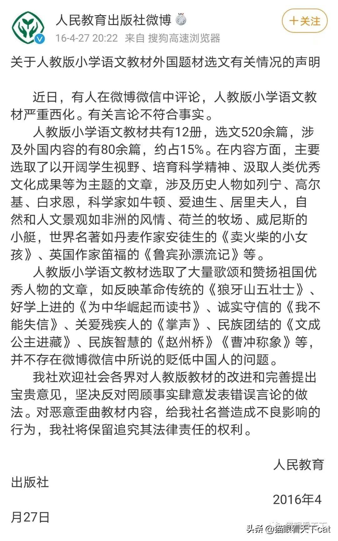 关于毒教材,十多年前就有网民举报,然而所有的举报均泥牛入海,甚至曾在2016年4月对于群众举报,人民教育出版社官方微博公开做出回应。一篇声明,斩钉截铁,义正辞严。
