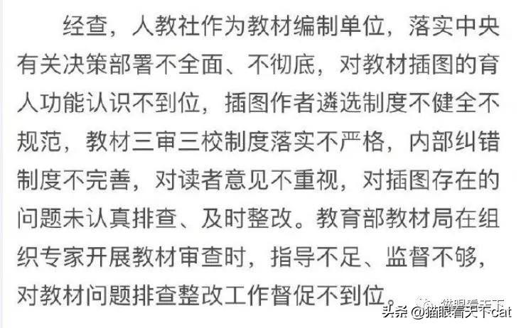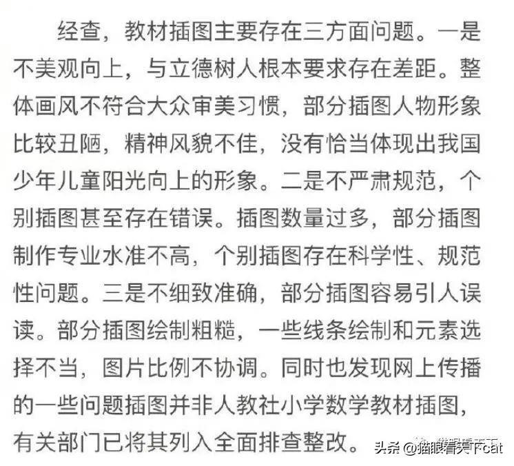 在这份调查处理通报中,先是承认了人民教育出版社在教材插图问题上存在的三个问题。简单地来说是: