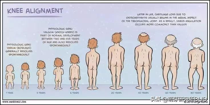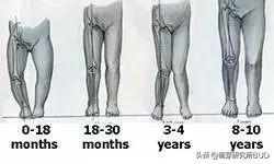 其实人的一生腿型一直在变化,从O型腿到X型腿,再到正常,直到老年之后又回到O型腿的状态,如下图: