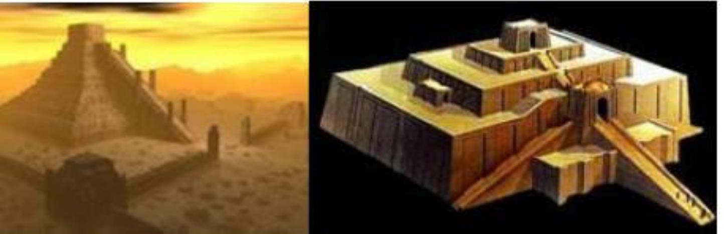 注意 “圣山”,上帝在山巅之处。在<以西结书>28 章,上帝又一次说: “所以我因你亵渎圣地,就从神的山驱逐你。”现在巴别塔经常以错误的图像显示出来,你经常看到是这样:但是事实上,巴别塔是一种庙塔,有金字塔的形状: