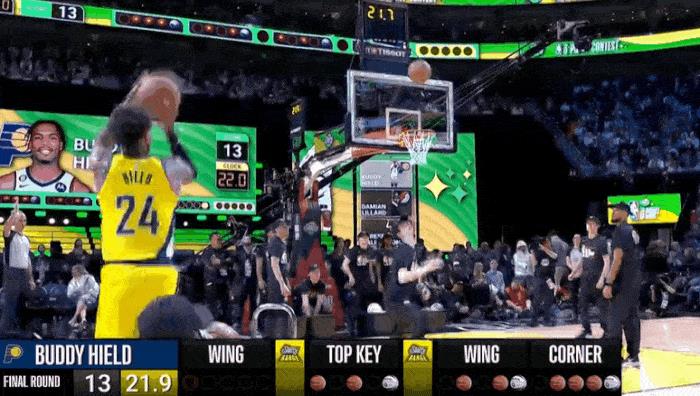 最后的决赛为利拉德和哈里伯顿还有希尔德这三位球员,首先出场的为希尔德,希尔德首轮拿到23分,但是这次他会在手软了,这轮他表现非常出色拿下25分