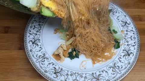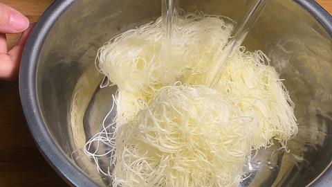 5、 将生抽淋在米粉上面,不要沿锅边淋