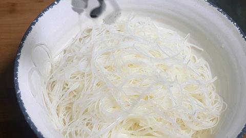 2、 控干水分的米粉加入植物油,用筷子拌匀,这样炒的时候不坨不粘连