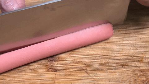 5. 火腿肠一根剥去外皮,然后从中间切开,再斜刀切成薄片