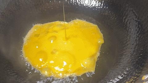 3、 用铁锅炒锅气十足,油热倒入鸡蛋液,炒成鸡蛋碎