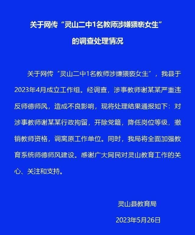 关于网上流传的“灵山中学教师一号”的谣言2号涉嫌骚扰女生”,我区于2023年4月成立专案组。经调查,涉事老师谢某某严重违背了师德师风。不利影响。现将处理结果通报如下:涉案教师谢某某被行政拘留、开除党籍、降级、吊销教师资格、调离原工作单位。同时,我局将全面加强教育系统师德建设。感谢广大网友对灵山教育工作的关心、关心和支持。