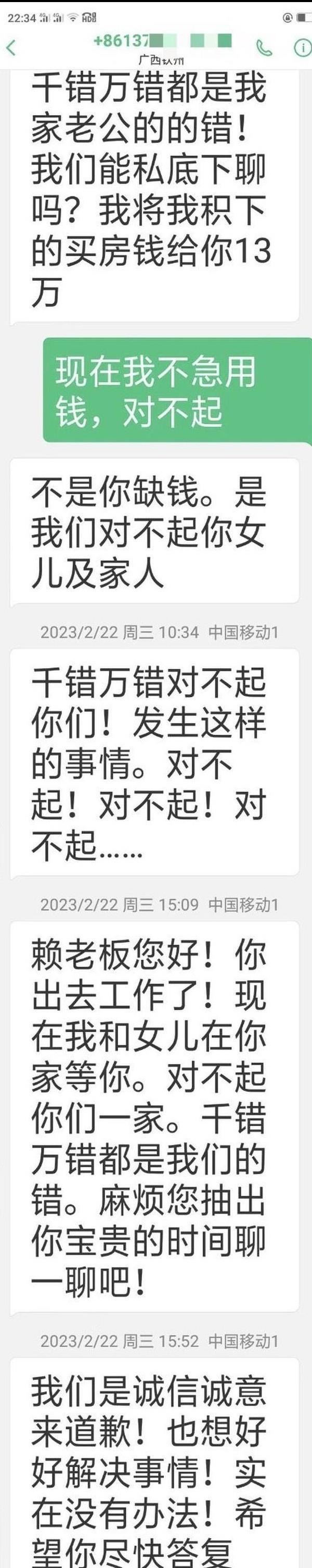 赖女士告诉记者,2月22日上午,一名自称谢老师妻子的人给赖女士父亲发短信要求隐私。