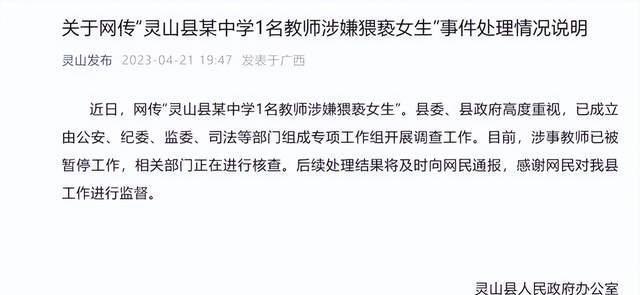 4月21日,灵山就此事发布通知:县委、县政府高度重视,已成立由公安、纪委、监察委、司法等部门组成的专案组,全力查处。开展调查工作。目前,涉案教师已被停职,相关部门正在核实中。后续处理结果将由网管及时公布,感谢您对我县工作的监督。