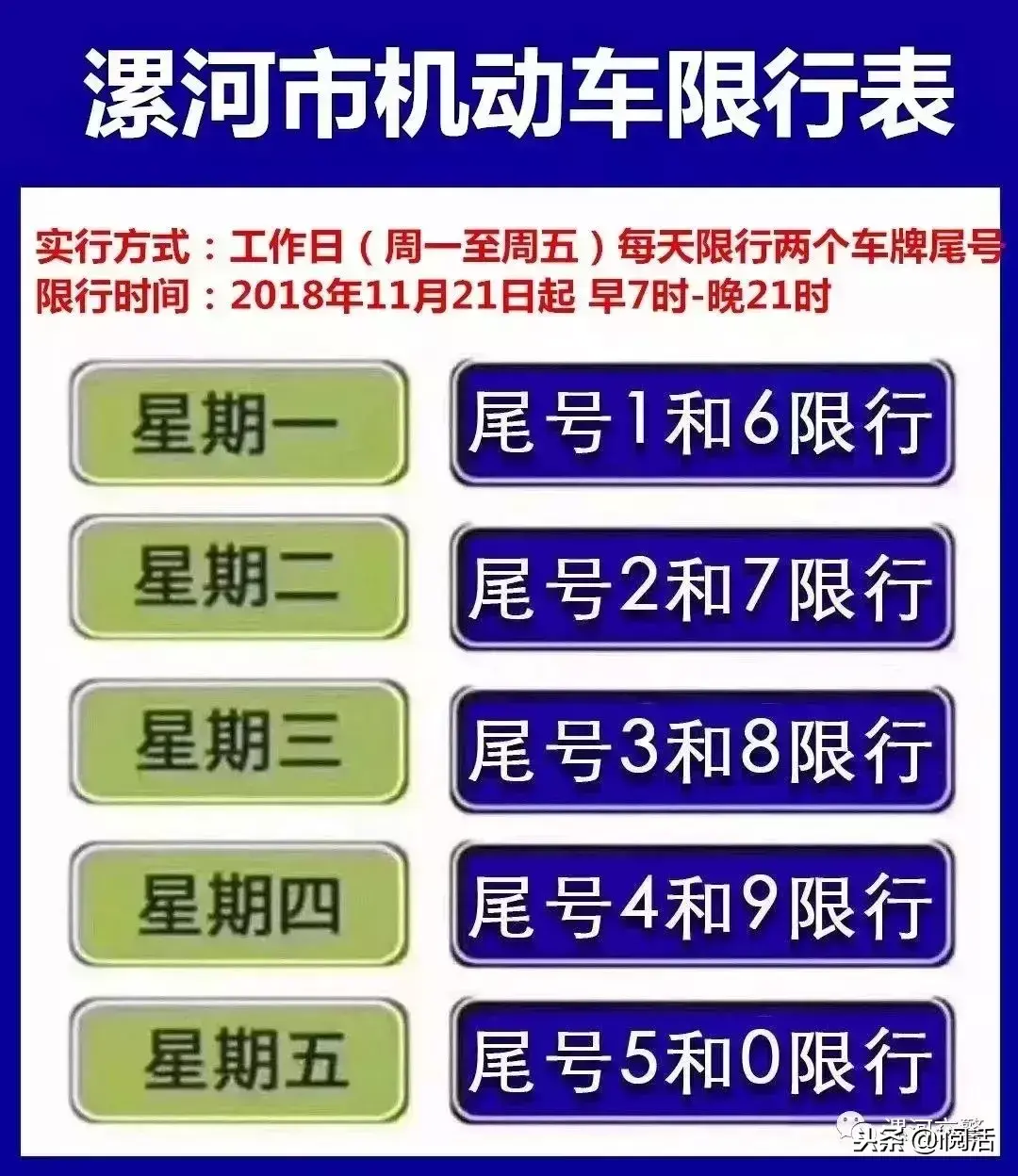 12 月 24 日,漯河市公安局交通管理支队官方微信公众号 " 漯河交警 " 发布通告称:2018 年 12 月 22 日发布的《漯河市污染防治攻坚战领导小组办公室漯河市公安局交通管理支队关于市区道路实施机动车单双号限行的通告》自 2018 年 12 月 24 日 24 时起暂停施行 ;2018 年 11 月 17 日发布的《漯河市人民政府关于市区道路实施机动车限行的通告》自 2018 年 12 月 25 日 0 时起恢复施行。即:工作日 7 点至 21点间限行,每天限行 2 个尾号。