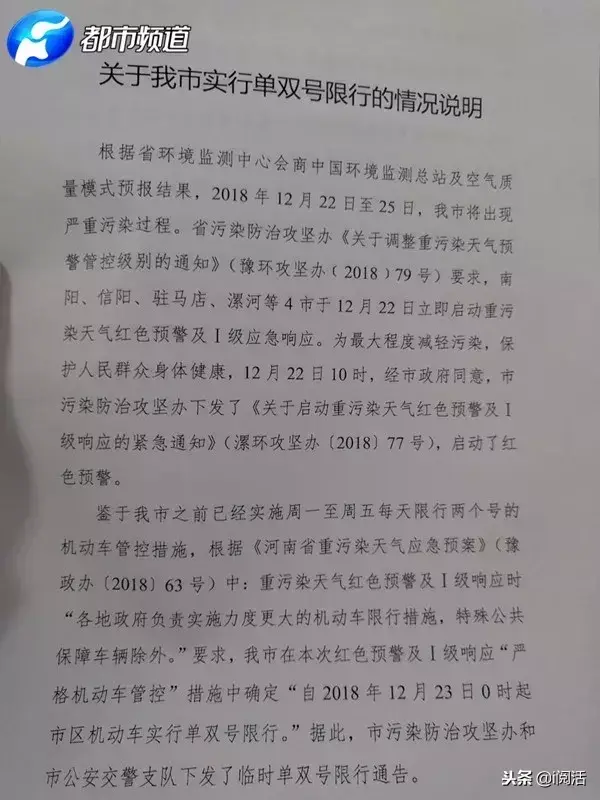 鉴于漯河市之前已经实施周一至周五每天限行两个号的机动车管控措施,根据《河南省重污染天气应急预案》(豫政办〔2018〕63 号)中:重污染天气红色预警及Ⅰ级响应时 " 各地政府负责实施力度更大的机动车限行措施,特殊公共保障车辆除外 " 要求,漯河市在本次红色预警及Ⅰ级响应 " 严格机动车管控 " 措施中确定 " 自 2018 年 12 月 23 日 0 时起市区机动车实行单双号限行。" 据此,漯河市污染防治攻坚办和漯河市公安交警支队下发了临时单双号限行通告。