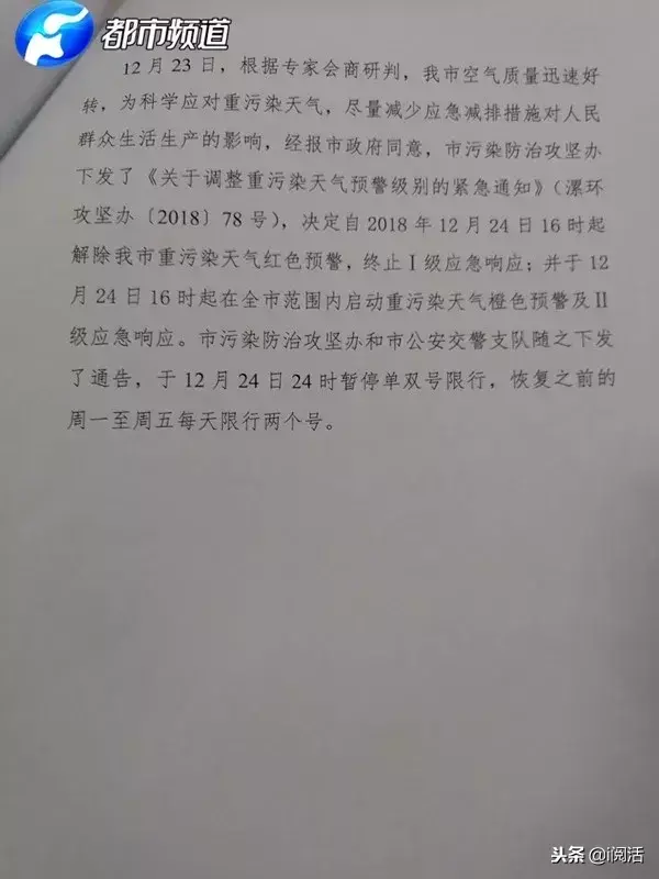 12 月 23 日,根据专家会商研判,漯河市空气质量迅速好转,为科学应对重污染天气,尽量减少应急减排措施对人民群众生活生产的影响,经报市政府同意,漯河市污染防治攻坚办下发了《关于调整重污染天气预警级别的紧急通知》(漯环攻坚办〔2018〕78 号),决定自 2018 年 12 月 24 日 16 时起解除我市重污染天气红色预警,终止Ⅰ级应急响应;并于 12 月 24 日 16 时起在全市范围内启动重污染天气橙色预警及Ⅱ级应急响应。漯河市污染防治攻坚办和市公安交警支队随之下发了通告,于 12 月 24 日 24 时暂停单双号限行,恢复之前的周一至周五每天限行两个号。