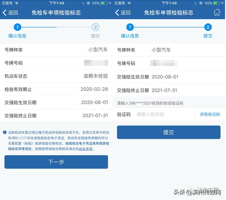 确认车辆信息页面,包括号牌种类、号牌号码、机动车状态、检验有效期止等信息后,进入资料信息填写页面,用户需上传交强险、车船税凭证照片,点击【下一步】进入信息确认提交页面,用户再次核对免检车申领检验标志申请信息,待确认所填资料信息无误后,获取手机短信验证码,核验通过后,点击【提交】按钮,完成免检车申领检验标志业务申请信息提交。