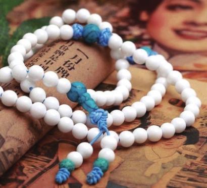 洁白的砗磲能够磨制成非常漂亮的白色珠子,这样优秀的珠子怎么能够不制作成珠串来使用呢?可以看到这个珠串虽然主要是由白色砗磲做的,但在中间加入了蓝色的绿松石和蓝色丝线编织而成的纽扣结。上述两者虽然颜色相同,但是却给这一串珠链带来了不同的修饰效果。前者不仅直径比白珠子要大一点,同时它上面的花纹也给这条手串增加了独特和个性的感觉。而蓝色纽扣结虽然比较的软,但是丝线的缠绕就很好的为这条手链增加了层次感。这样一款首饰,缠绕在女性白皙的手腕上应该是非常漂亮的。