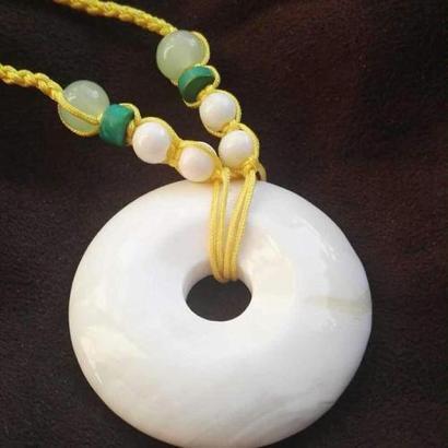 平安扣是生活中很多见的一个首饰,我们经常会将各种各样宝石做成平安扣的形状,比如说和田玉和翡翠等。其实,砗磲同样也可以制作成平安扣。砗磲纯洁高雅的白色和平安扣吉祥如意的祝福相结合,让它看起来特别的像古代的君子,既有德行又有内涵。此外,这一枚平安扣的链条是由黄色丝线制作而成的,在编织时还在其中添加了砗磲珠、绿松石珠以及玉石珠。丝线和上述几种珠子加入,不只是为这个项链增加了层次,同时为它增加了几分贵气。