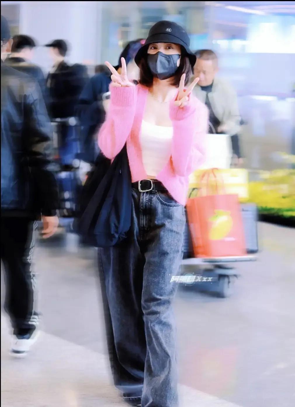 红色毛绒外套搭配白色小背心,下穿一条宽松牛仔裤,黑色的大手提包,帽子和口罩,低调又不失个性,看起来也是huo力满满,尤其是粉色的外套更添huo力和生机。