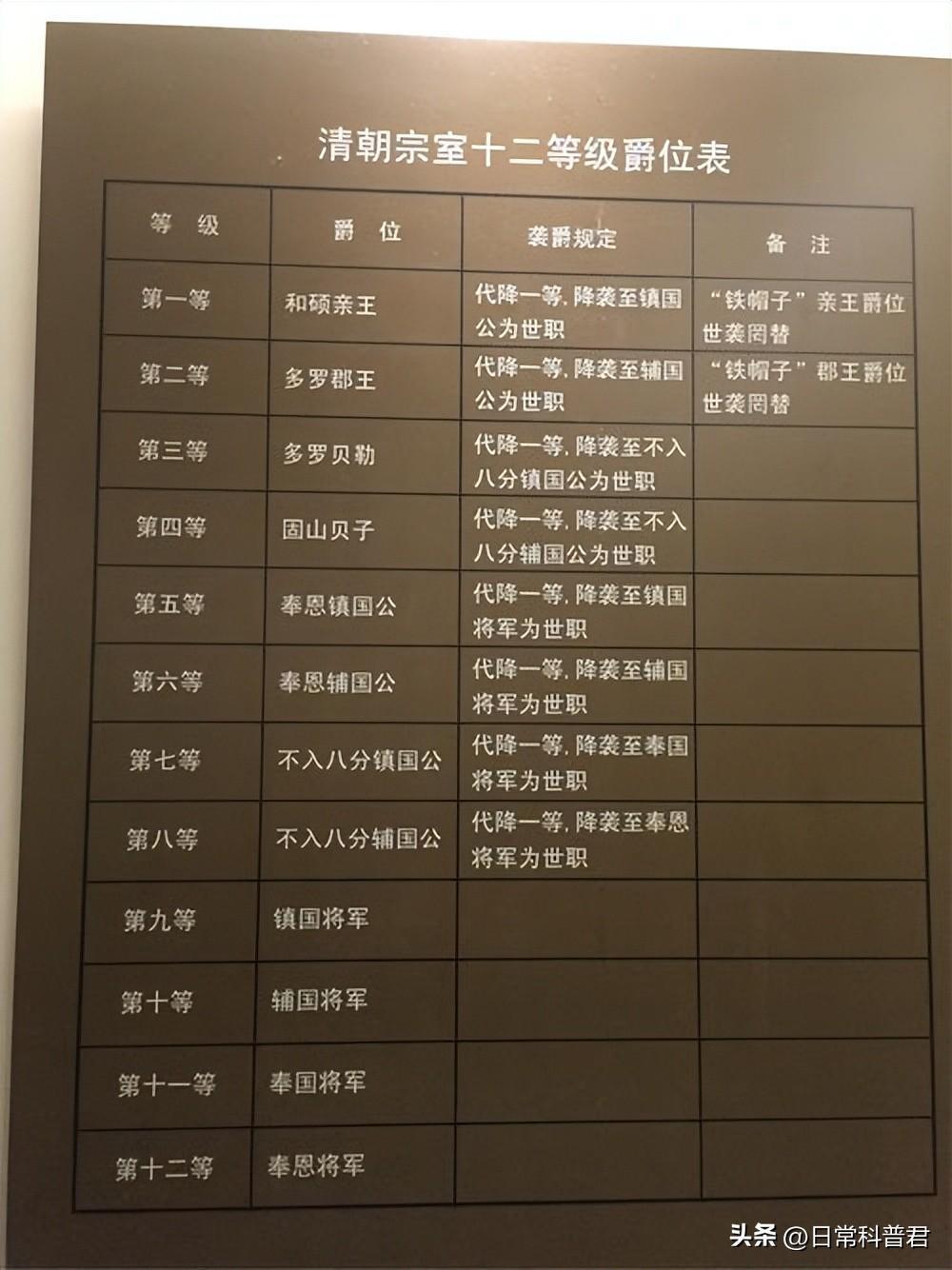 从上到下共有十二等,分别是和硕亲王,多罗郡王,多罗贝勒,固山贝子,奉恩镇国公,奉恩辅国公,不入八分镇国公,不入八分辅国公,镇国将军,辅国将军,奉国将军,奉恩将军。
