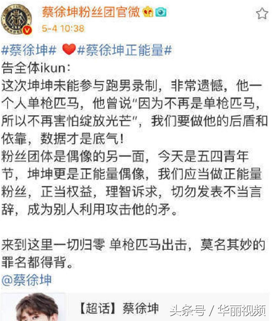 就在今天蔡徐坤官方粉丝团放出消息说蔡徐坤因为其他原因,缺席了《奔跑吧》的录制,说实话小编在之前还真不知道蔡徐坤要去录制《奔跑吧》,没有想到的是这一次蔡徐坤缺席录制却上了热搜,但是令人反感却是蔡徐坤官方粉丝团的一句话,说好听点是措辞不够严谨,不好听就是自己打脸。