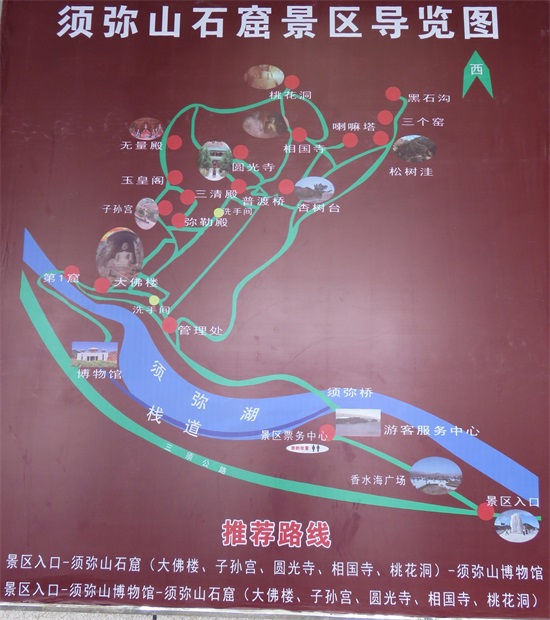去须弥山石窟可在固原乘公交车去三营镇,在镇北的路口有车去须弥山石窟;也可乘火车到三营镇,火车为银川到长庆桥,中间停三营镇,每天一班,可在三营住宿一晚,第二天乘车前往须弥山石窟游览。三营镇原为清朝驻军所在地,故名三营,居住人员主要为回族。2017年6月13日我们从平凉乘火车到三营,火车为绿皮车,茶水炉也为老式烧煤炉,车厢内装有电扇,第二天包车去须弥山石窟。景区景点主要为:自然风光,洞穴,怪石,人文地理,佛教石窟,景区依地理位置分前山后山二大景点。
