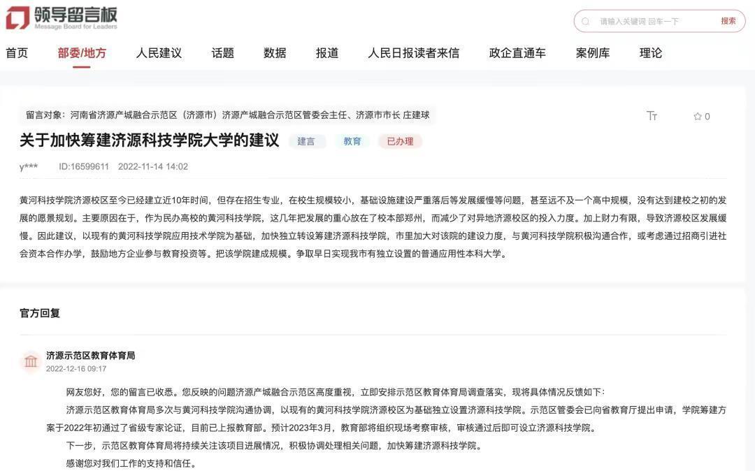 好消息传来了,近日济源示范区教育体育局在留言板回答一些问题,其中明确表示有意筹建济源科技学院,而且已经向省教育厅提出申请了,只等待2023年3月教育部组织现场考察了。由此可见,济源当地的第一所本科院校即将来临,当地也即将结束没有本科院校的历史。值得注意的是该校就是在黄河科技学院济源校区的基础上独立设置的,未来该校将与黄河科技学院“分家了”。