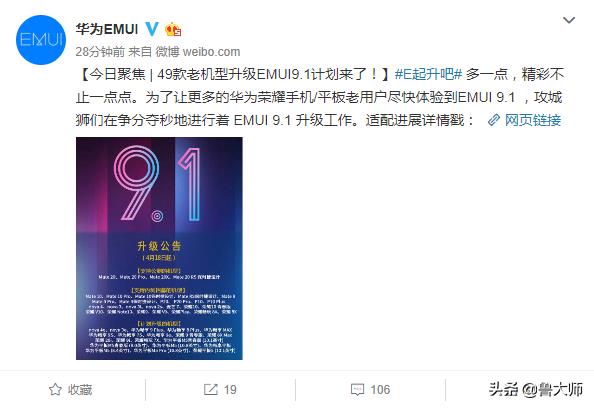 今日,华为官方放出了EMUI9.1升级计划表,支持49款老机型升级。