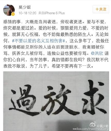 莫少聪微博全文:“感情的事,大概是当局者迷,旁观者更迷。爱与不爱,终究都是爱过的。爱的时候,狠狠爱用力爱,不爱的时候,就算无心祝福,也不妨做最熟悉的陌生人。无论如何,不要以爱的名义互相伤害,这么多年了,我做任何事情都能见到你的人追在后面泼脏水,我离婚被你骂,抚养女儿被你骂,连做公益也要被你骂。@洪欣请你扪心自问,当年的事,真的错都在我吗?我沉默不代表我不敢说,为了儿子,希望不要再有下一次。”