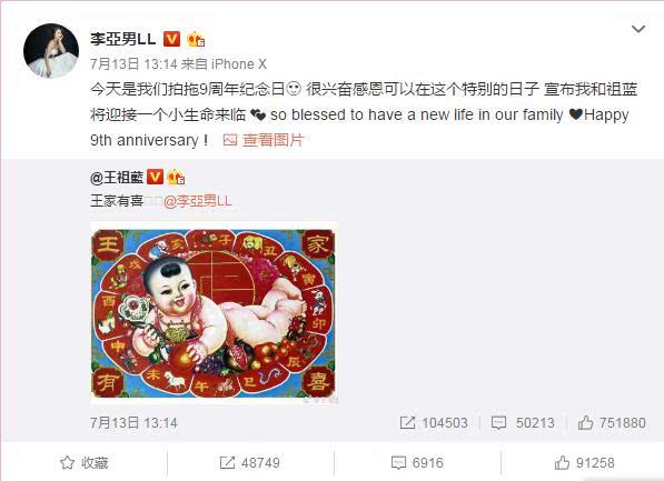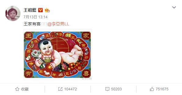 7月13日,王祖蓝在微博上发文:王家有喜,并且@妻子李亚男,随后李亚男转发该微博,并配上了一张宝宝的B超图。