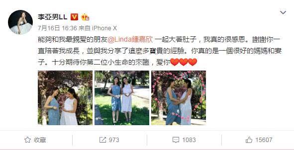 在拍拖9周年纪念日,王祖蓝夫妇共同宣布了他们爱情结晶的到来,实在是可喜可贺。7月16日,李亚男再次发文,与怀二胎的好友钟嘉欣互摸孕肚,幸福溢于言表。